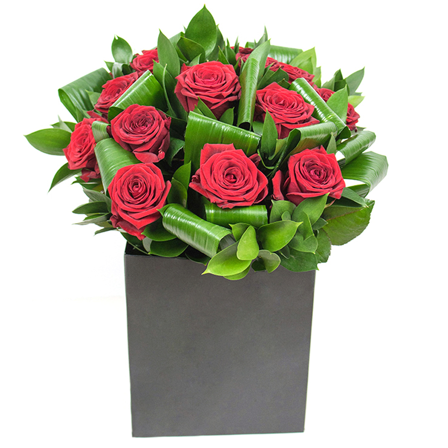 Enhance your home decor with our beautiful bouquet, featuring vibrant red roses, lush aspidistra leaves, and delicate ruscus. This unique arrangement is crafted to bring both beauty and sophistication to any space.
