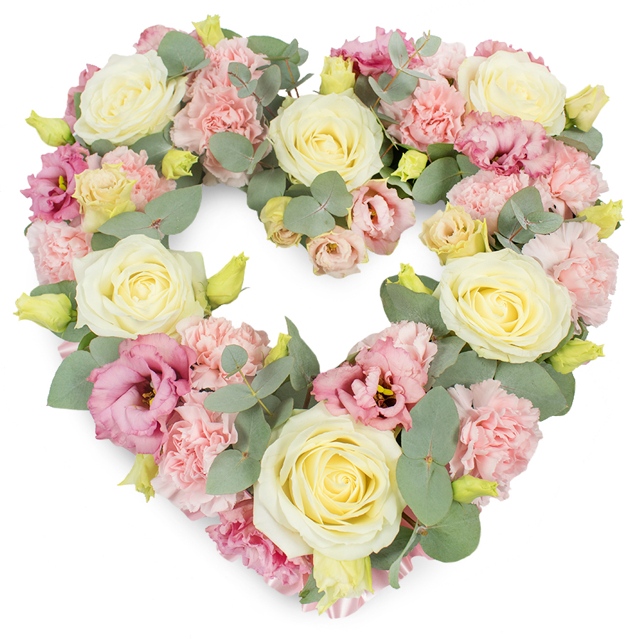 Express your deepest sentiments with our Heartfelt Elegance Tribute Bouquet. This stunning arrangement combines white roses, pink carnations, delicate pink lisianthus, and fragrant eucalyptus, all meticulously hand-selected for their premium quality and freshness.